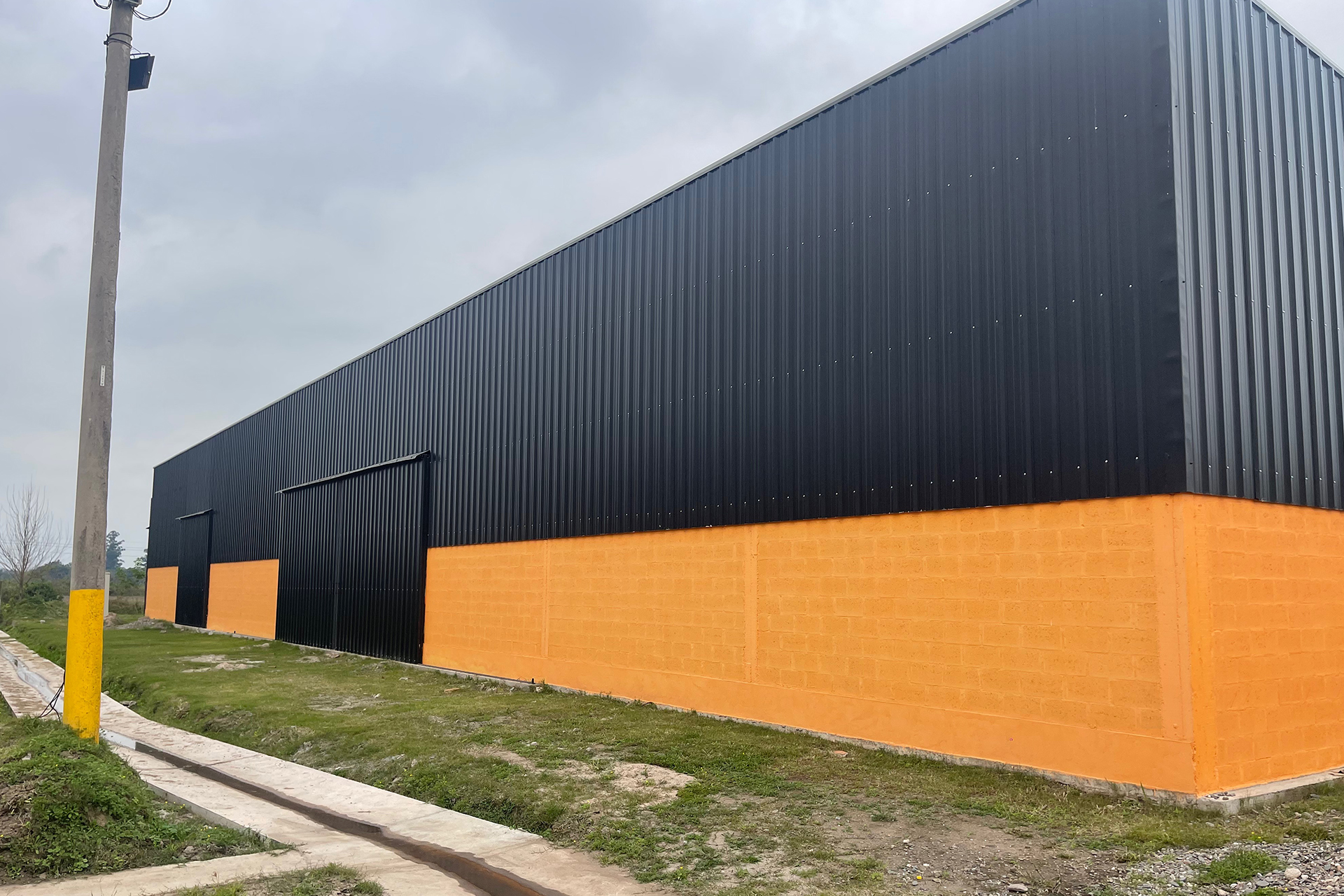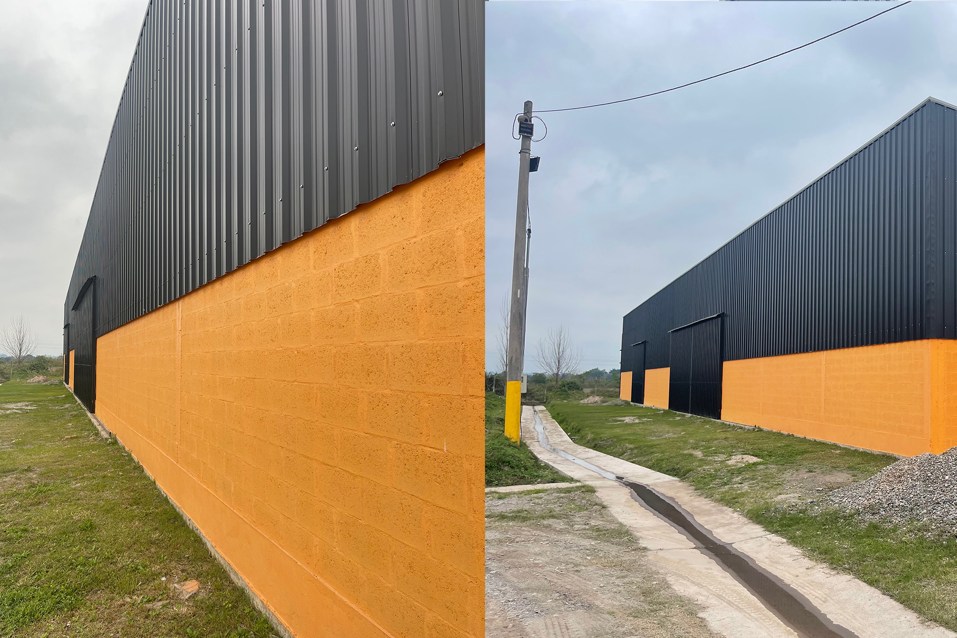 Mampostería de bloques de cemento en primer nivel y chapa trapezoidal color en segundo nivel.